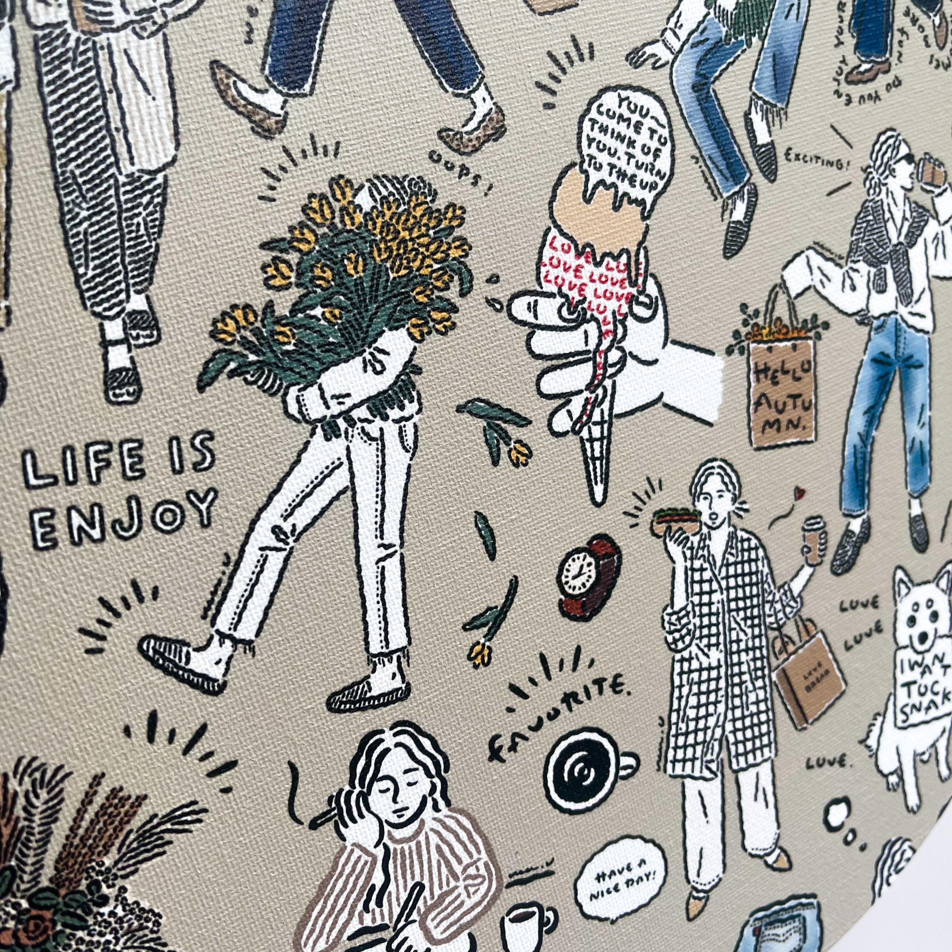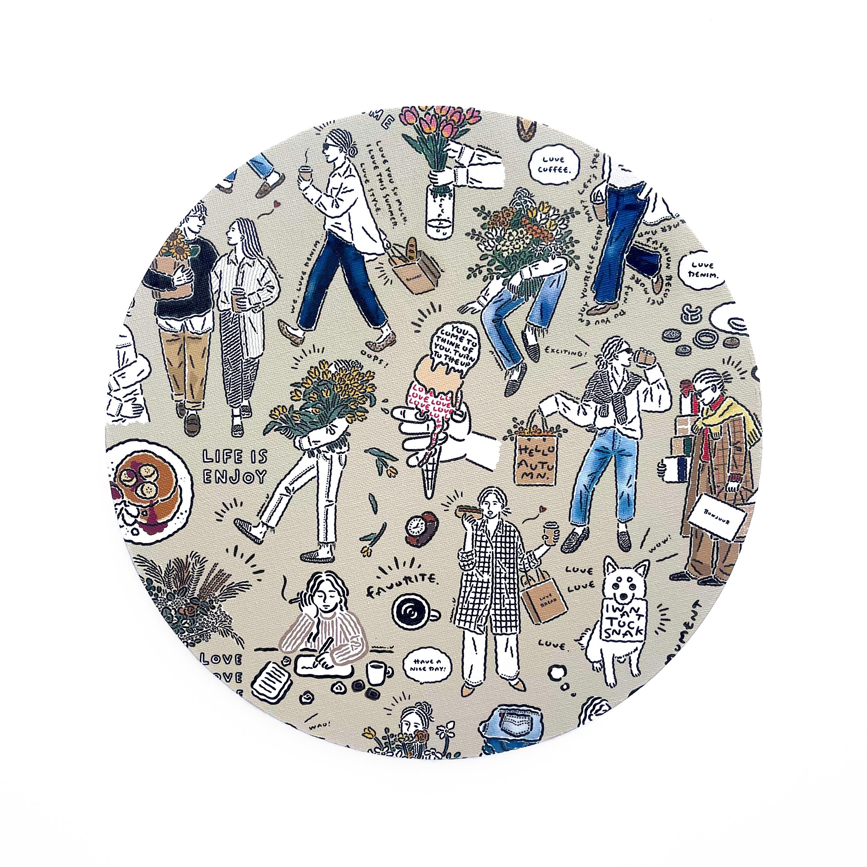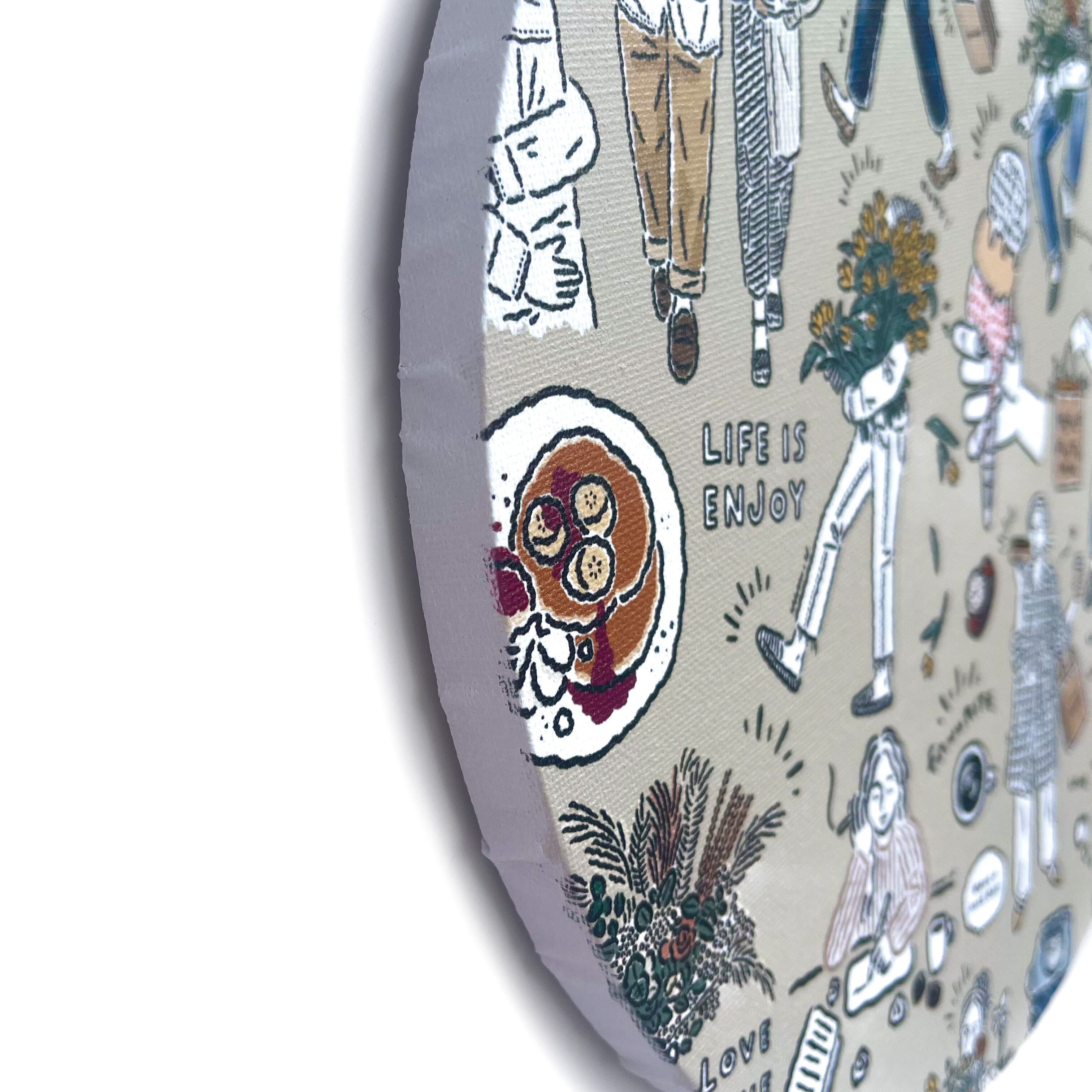 街行く人々やアイテムを詰め込んだ丸型キャンバスボード。